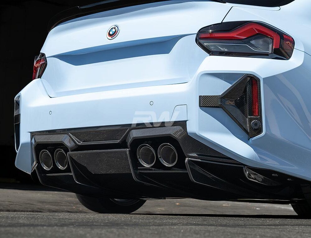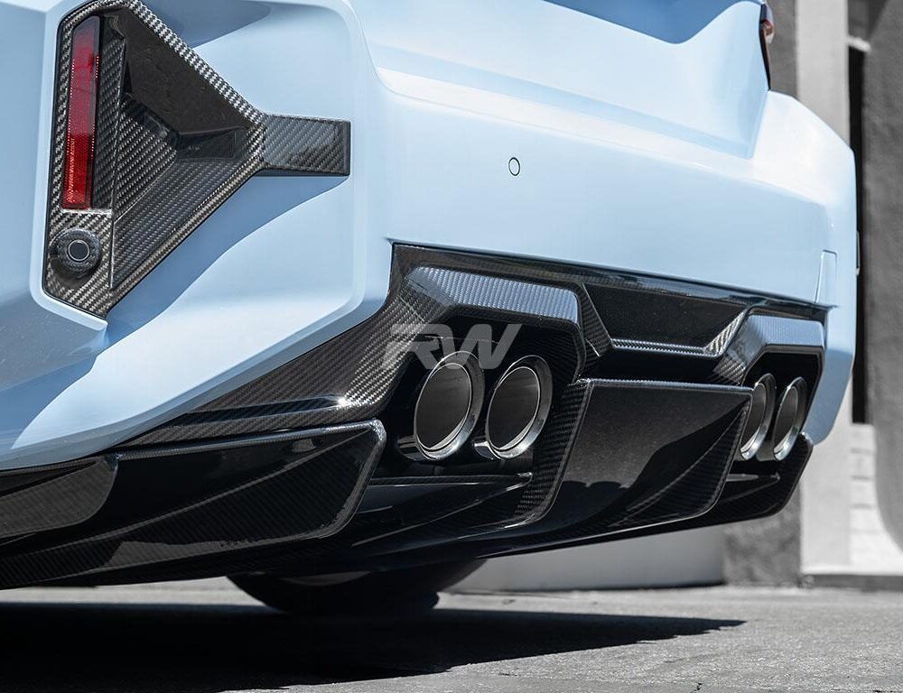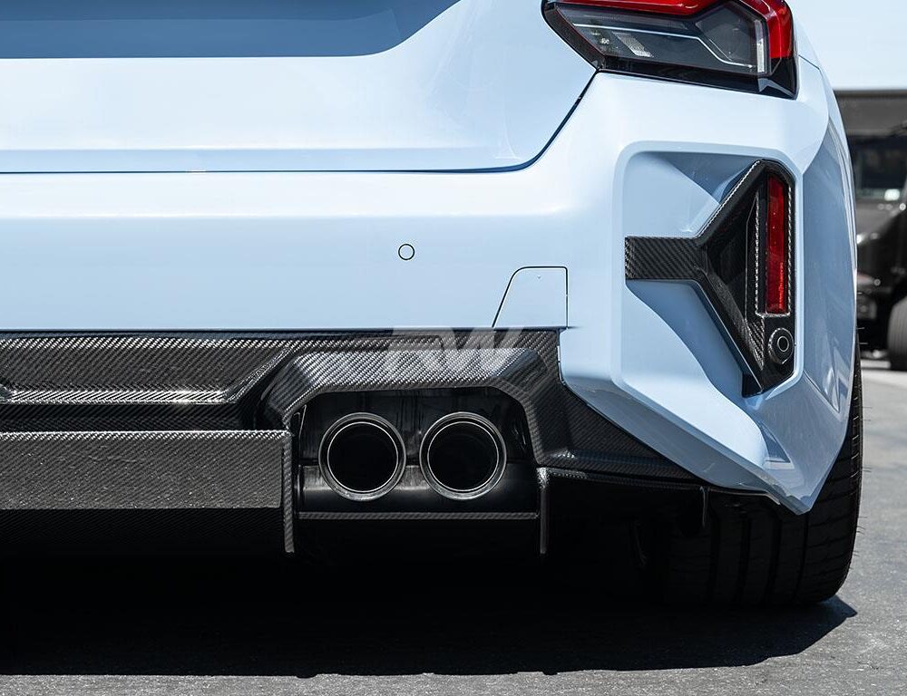 The BMW G87 M2 Carbon Fiber GTX Diffuser+Undertray offers a bold and intricate enhancement for your BMW G87 M2. Made with high-quality DRY carbon fiber in a 2×2 weave pattern, this diffuser not only adds durability but also elevates the rear aesthetics, especially when combined with a trunk spoiler for a cohesive look. The kit includes the diffuser, undertray, and all necessary hardware for installation. Due to the intricate design and size of the diffuser, we recommend professional installation to ensure optimal fitment. Each component undergoes thorough quality checks and is securely packaged, ensuring you receive a pristine, brand-new part.