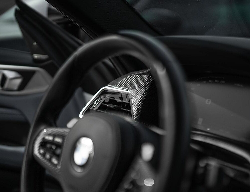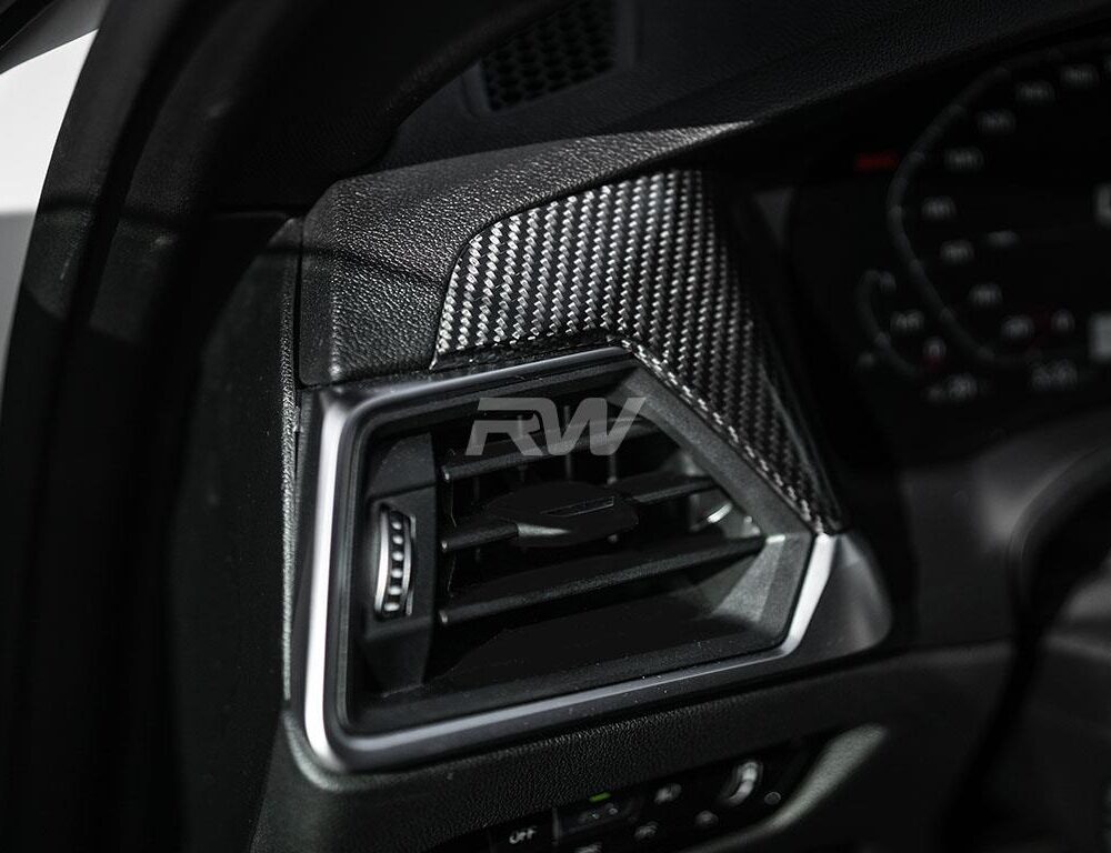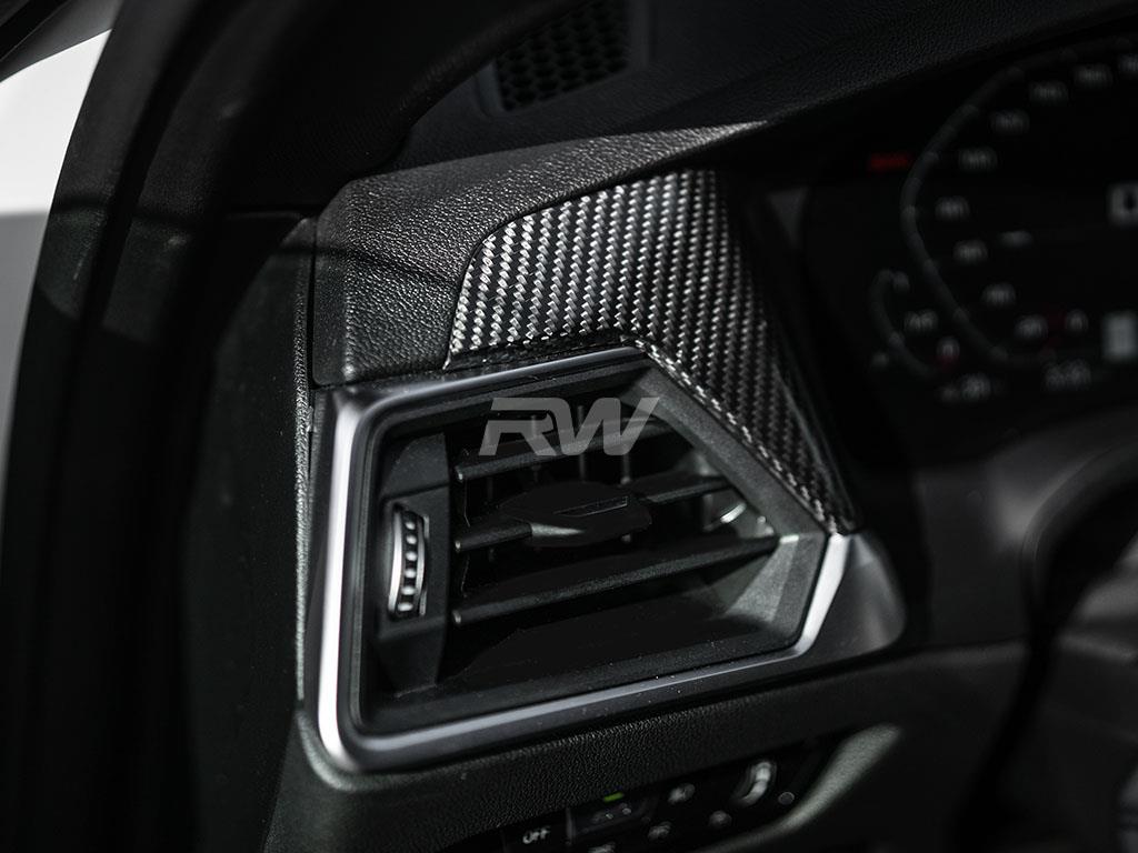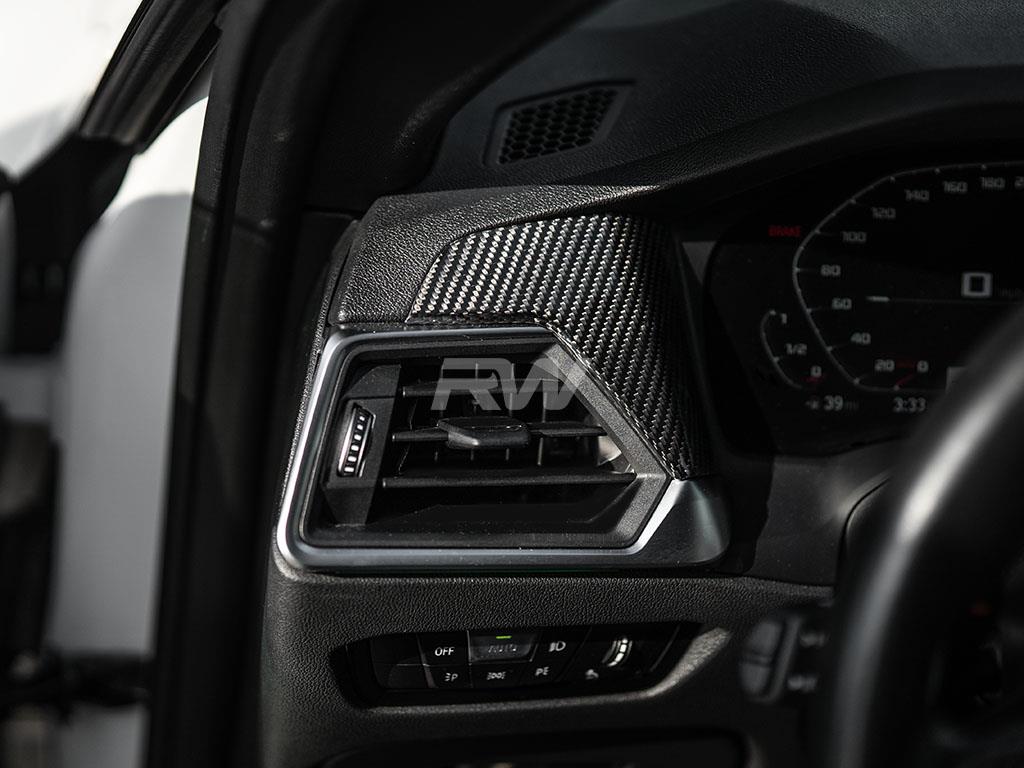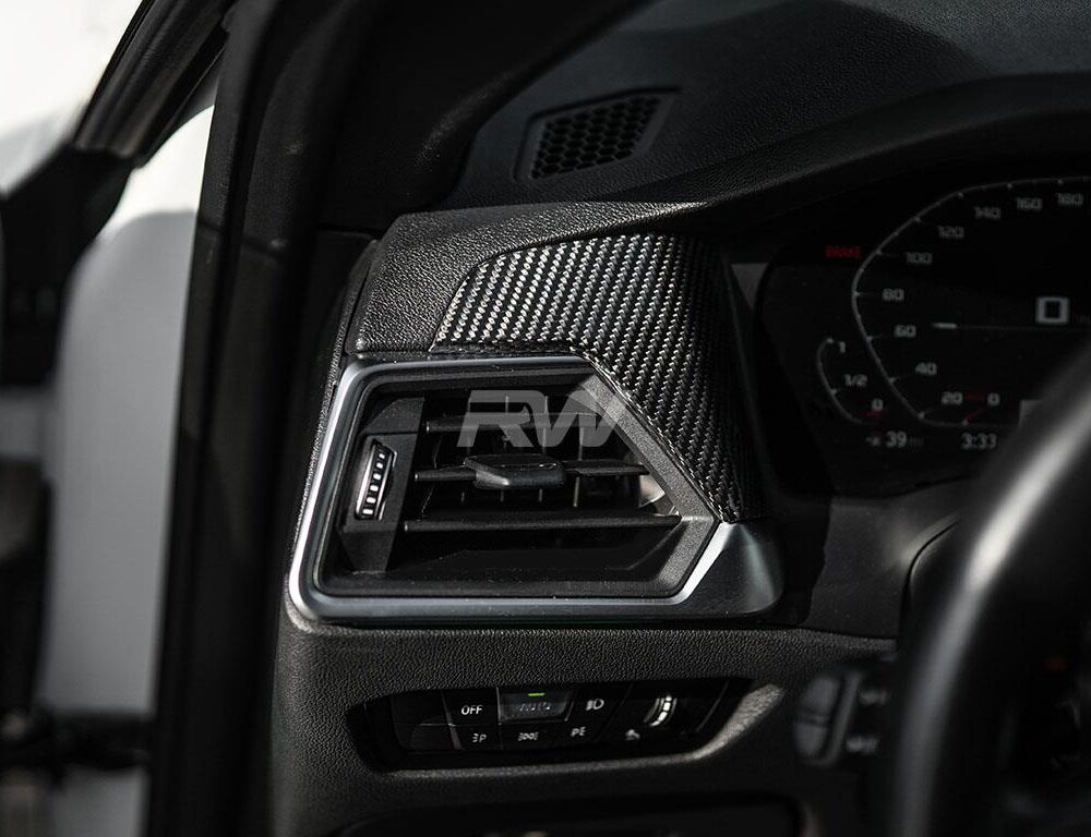 Invest in some unique interior carbon fiber with this carbon fiber air vent trim. RW Carbon has just the piece for you with this carbon fiber air vent trim that is always within eyesight to be constantly appreciated. This trim fits all 2021+ BMW G80 M3, G82/G83 M4, and G87 M2 models. Please note that certain model years come with the pre-curved display, while newer years are equipped with the updated curved display, so we have two different versions of this trim to ensure proper fitment depending on your vehicle’s display type. This trim is made using 100% real full 2×2 weave carbon fiber for a lightweight and durable product that looks great. This carbon fiber air vent trim installs over your existing air vent trim piece using 3M double-sided tape.