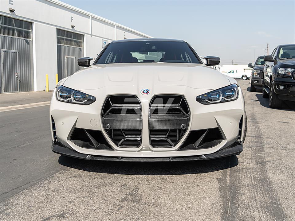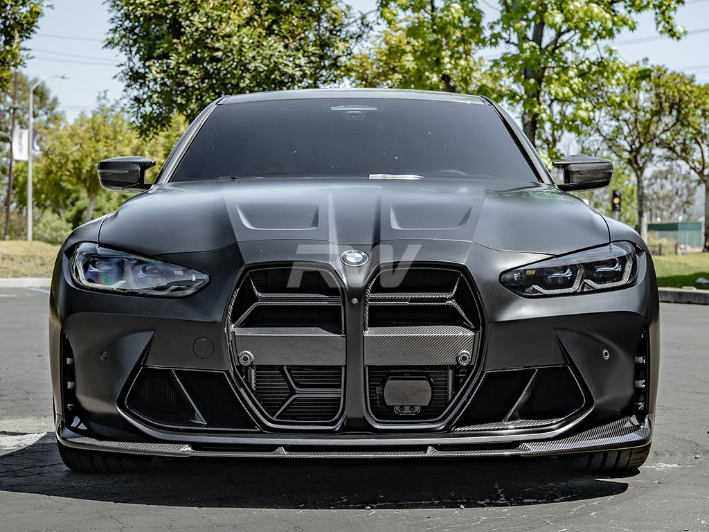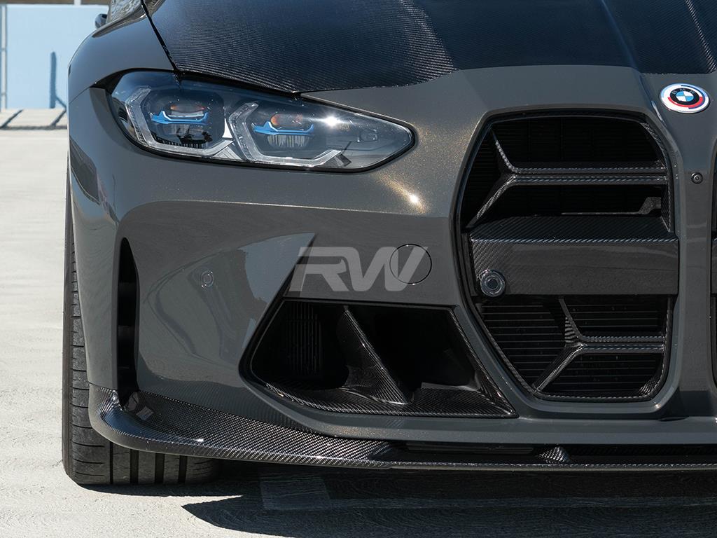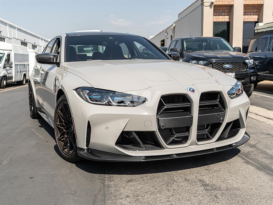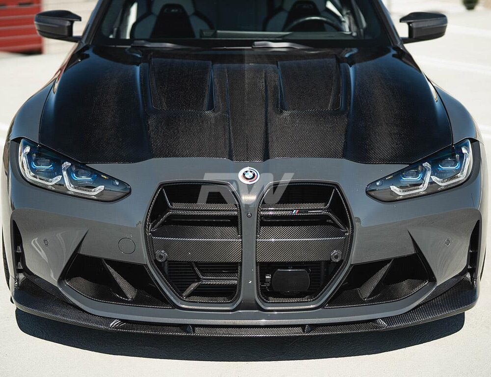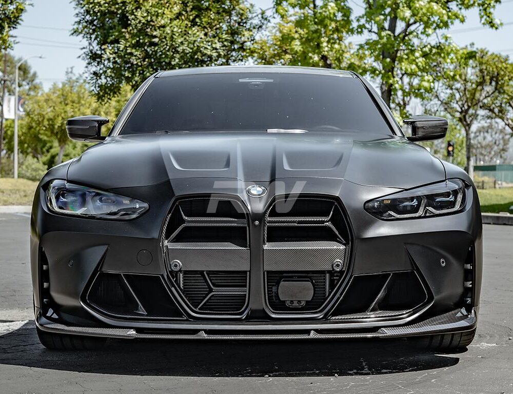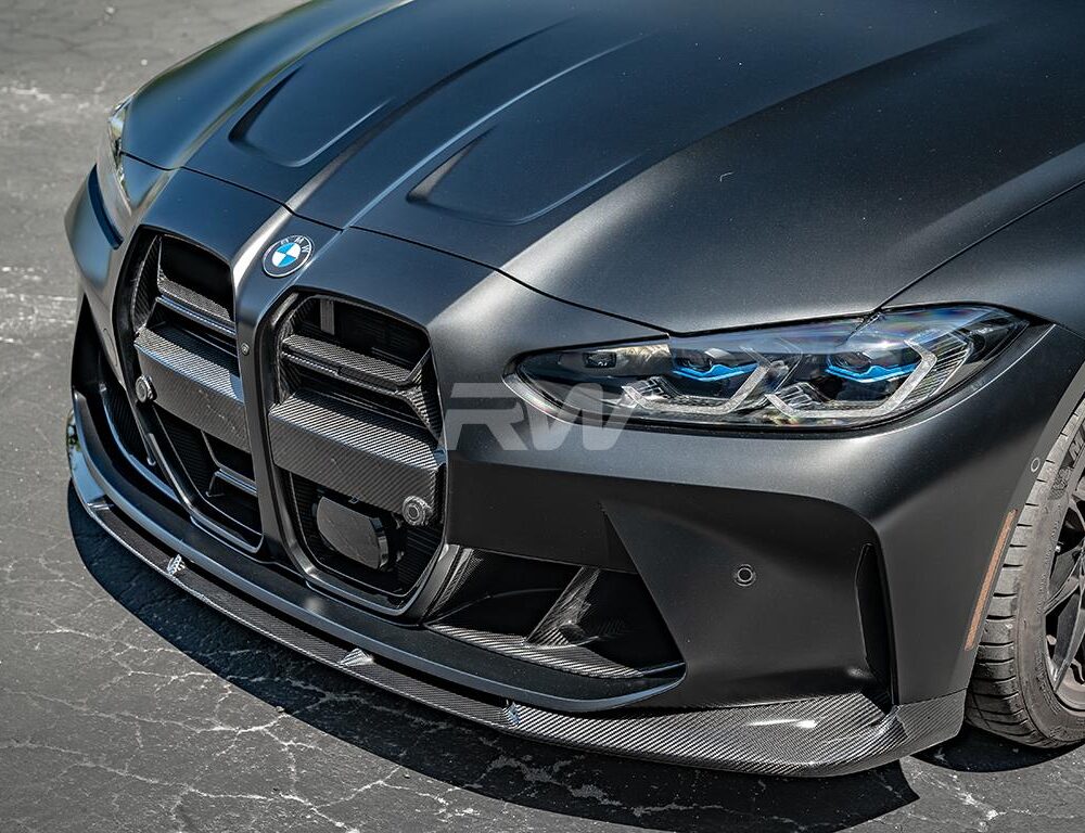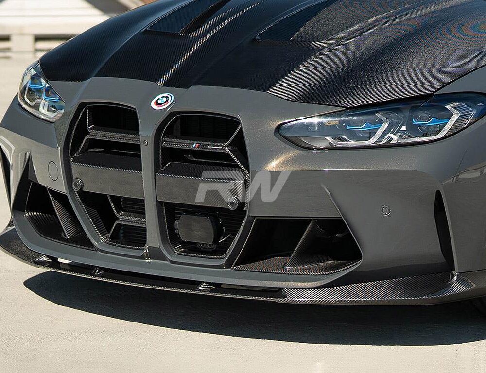 RW Carbon proudly introduces our next front lip option for the BMW G80 M3, G82 and G83 M4, this 3D Style Full Carbon Fiber Front Lip Spoiler. This 3D Style Front Lip has an aggressive design that adds bigger and bolder style to the vehicle while still maintaining good ground clearance. Like all of our other parts, this front lip is made from 100% dry carbon fiber and molded with precision to perfectly fit your G80, G82, and G83. After manufacturing, we coat each item with a UV-resistant clear coat to ensure the part remains vibrant over the years. The installation is straight forward and reuses the OEM screws and mounting locations but as always, we highly recommend having this piece installed by a professional.