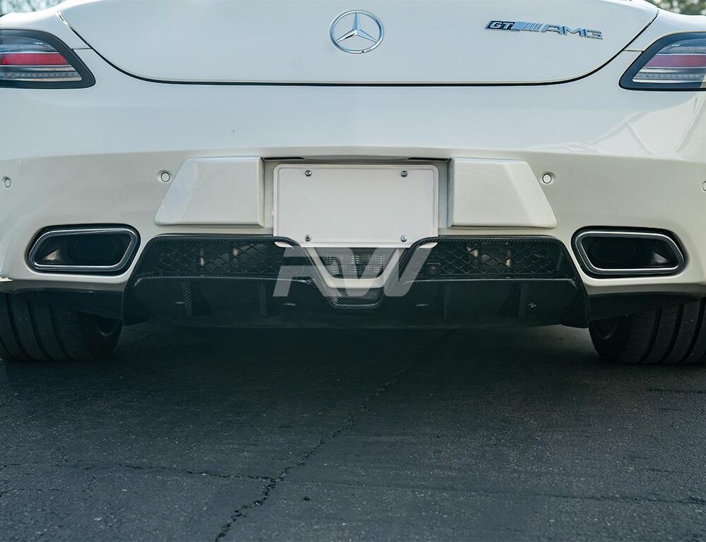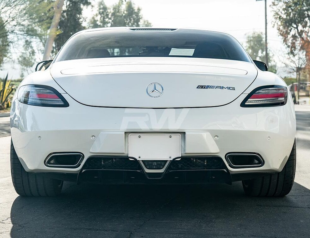 RW Carbon is very proud to introduce our first piece for the 2011-2014 Mercedes SLS Gullwing AMG, the Renn style carbon fiber rear diffuser. Our diffuser features FULL CARBON construction, making is ultra lightweight and durable. With great attention to detail, this diffuser features a tight carbon fiber weave along with a thick, high quality clear coat for that high gloss shine. These features help make this piece one you can be proud of to install on your SLS. Installation requires no special modifications and is simply bolt on and usually takes about an hour to complete. Unlike many other companies that make parts for your SLS we typically stock these SLS carbon fiber diffusers – No 4+ Month wait time when you order from RW Carbon. Please contact us about this SLS diffuser is you want availability or if you have any questions.