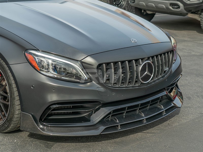 Introducing the first carbon fiber front lip spoiler for the new Mercedes W205 C63 AMG from RW Carbon. This BRS-style front lip is handcrafted from genuine 2×2 carbon fiber, making it lightweight, durable, and visually striking. Each lip is finished with a high-gloss clear coat for a radiant, mirror-like shine.