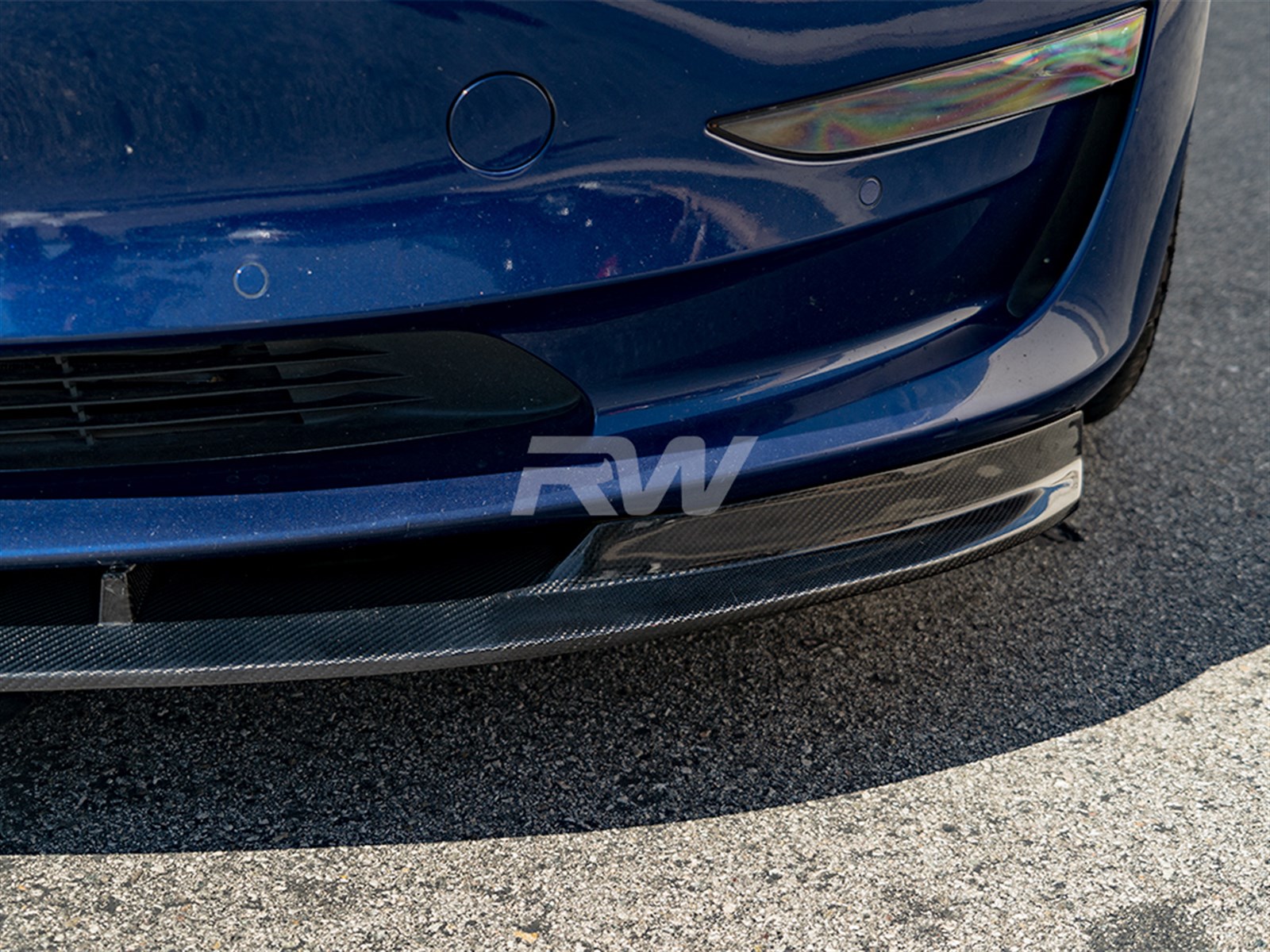 Be one of the first in your city to rock this new Tesla Model 3 RWS carbon fiber front lip spoiler! This spoiler is designed In-House at RW Carbon and is meant to add a sporty touch to your Model 3 while not affecting the drivability of your Tesla. We make the RWS items with 100% genuine carbon fiber fabric and is clear coated for that brilliant shine. Since this design was created at RW, we guarantee it will not look like anything you have seen before and will have other fellow Tesla Model 3 owners turning their heads for a second look. These RWS front lip spoilers for the Model 3 simply install using self-tapping screws and takes about 60 minutes to install. Get your very own today and see first hand what this RWS front lip will make on your Tesla Model 3.